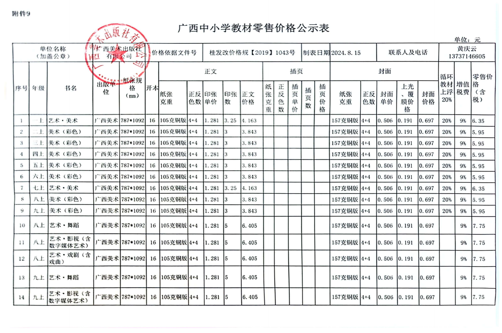 廣西美術(shù)出版社2024秋教材教輔零售價(jià)格公示