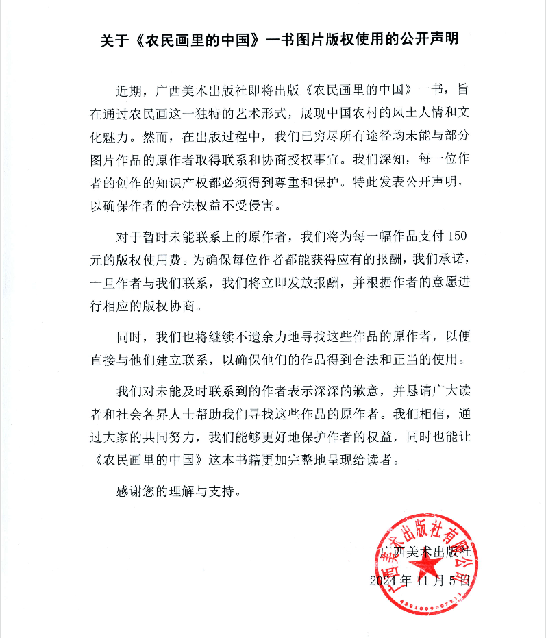 關(guān)于《農(nóng)民畫(huà)里的中國(guó)》一書(shū)圖片版權(quán)使用的公開(kāi)聲明