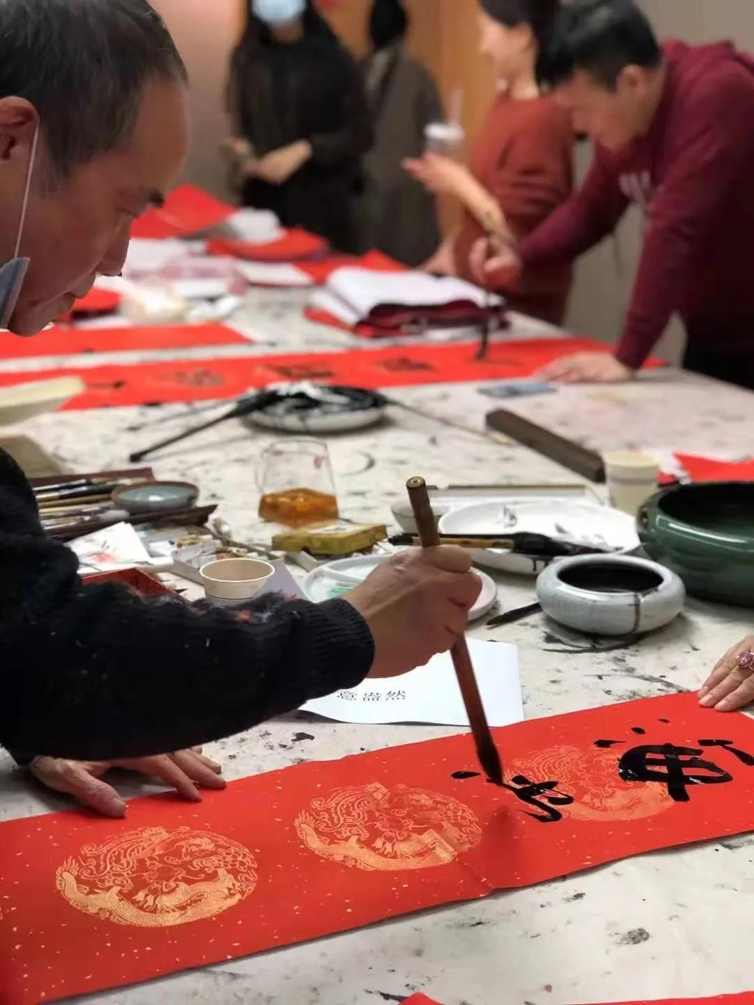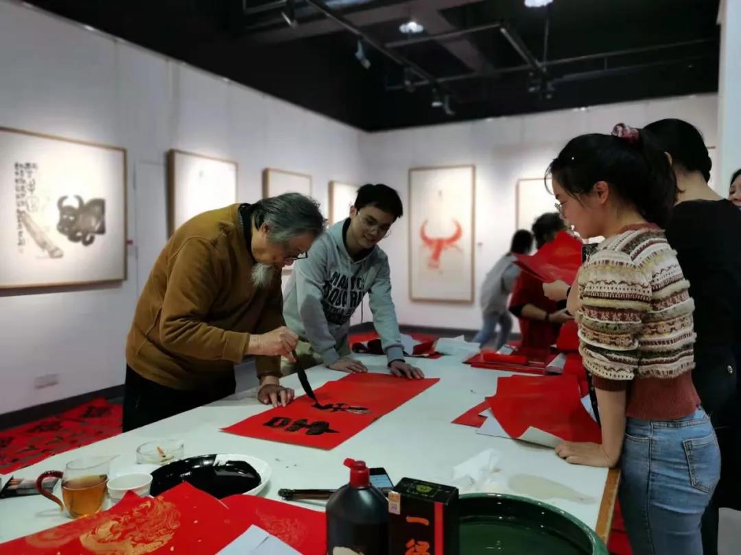 展覽首日恰逢農(nóng)歷的南方小年,當天下午,文化惠民贈春聯(lián)活動如火如荼。書法名家們揮毫潑墨、筆走龍蛇,帶著鼠隨寒冬去,牛送春風來的美好期許,把濃濃的祝福融進紅彤彤的春聯(lián)里,市民們爭相圍觀,紛紛排隊迎春接福。