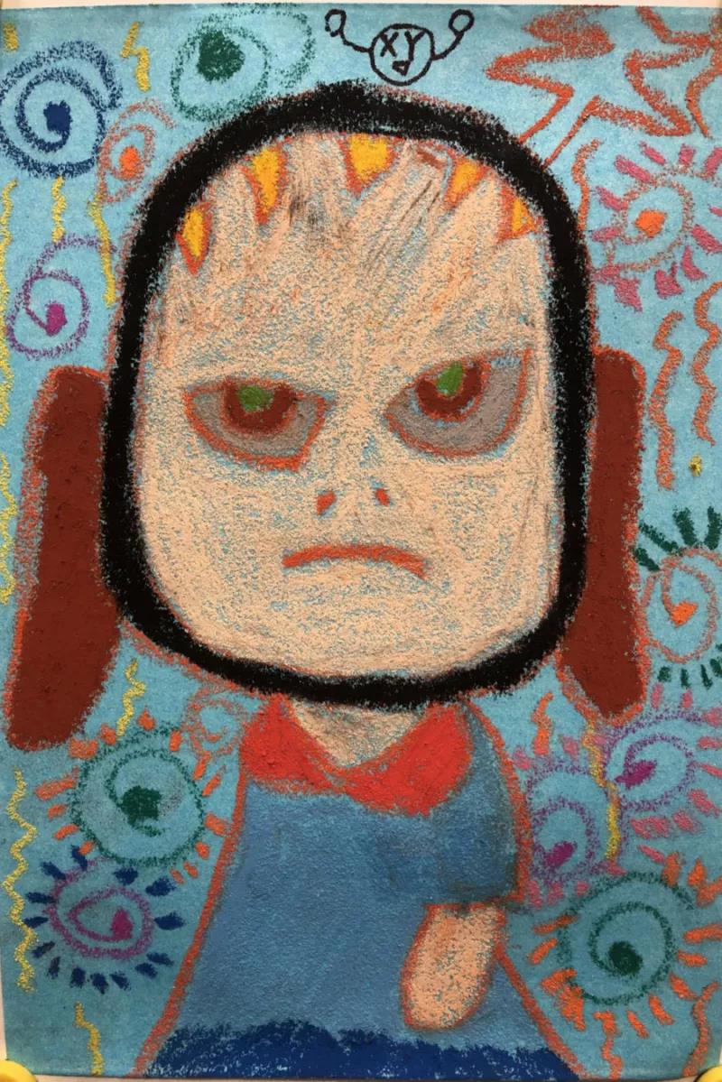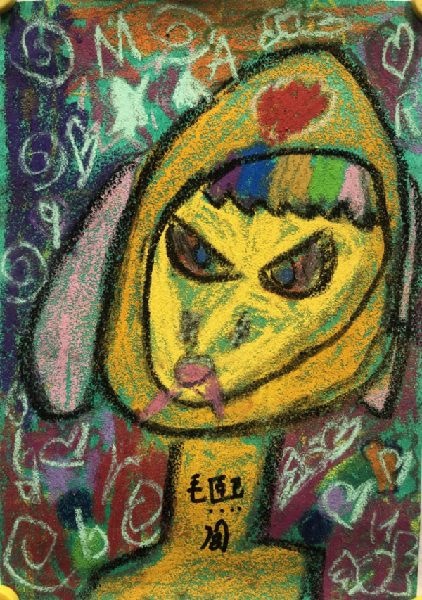 毛熙月(女)這幅畫借鑒了奈良美智的名作《寂寞的小狗》。畫中“似狗非狗”的形象給人一種另類的感受,小朋友使用了大量橘黃色描繪主體形象,加大直觀的沖擊力。這種看似格格不入的色調與裝扮,加上背景各種顏色的拼接和符號的添加,有種特立獨行的意味。