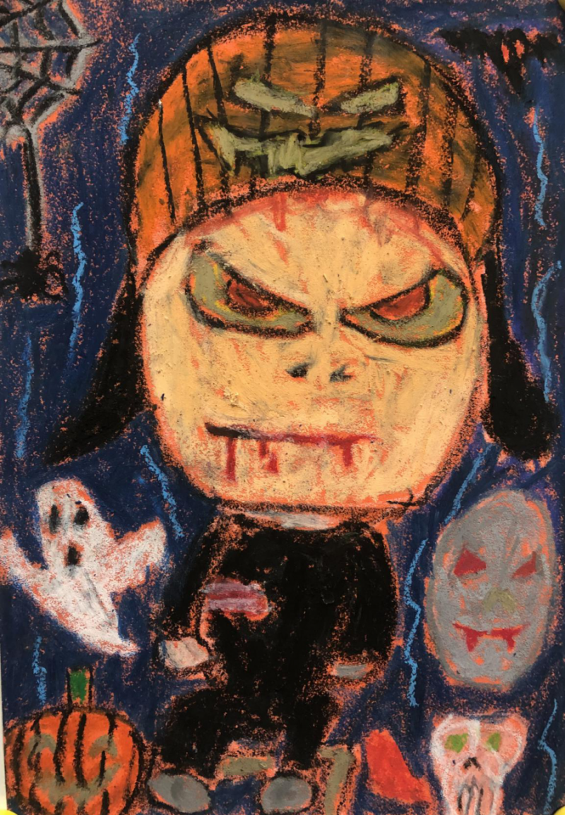 丘翊辰(男)小朋友這幅畫描繪了充滿搞怪的萬圣節(jié),我仿佛看到鄰居家的熊孩子跑來敲門向我要糖果的樣子。小畫家顏色搭配得非常好,畫面用深藍色來表現(xiàn)萬圣節(jié)的背景。幽靈的白色,南瓜的橘黃,鬼怪的灰色,蝙蝠、蜘蛛和衣服的黑色,全部混合搭配在一起又不會顯得色調沉重,萬圣節(jié)的各種元素搭配使用非常到位。一些零碎的點線面的裝飾,與背景色融合恰當。大臉娃娃的可怕表情和眼神,讓我有種不寒而栗的感覺,像是在說:“不給糖就搗蛋!”